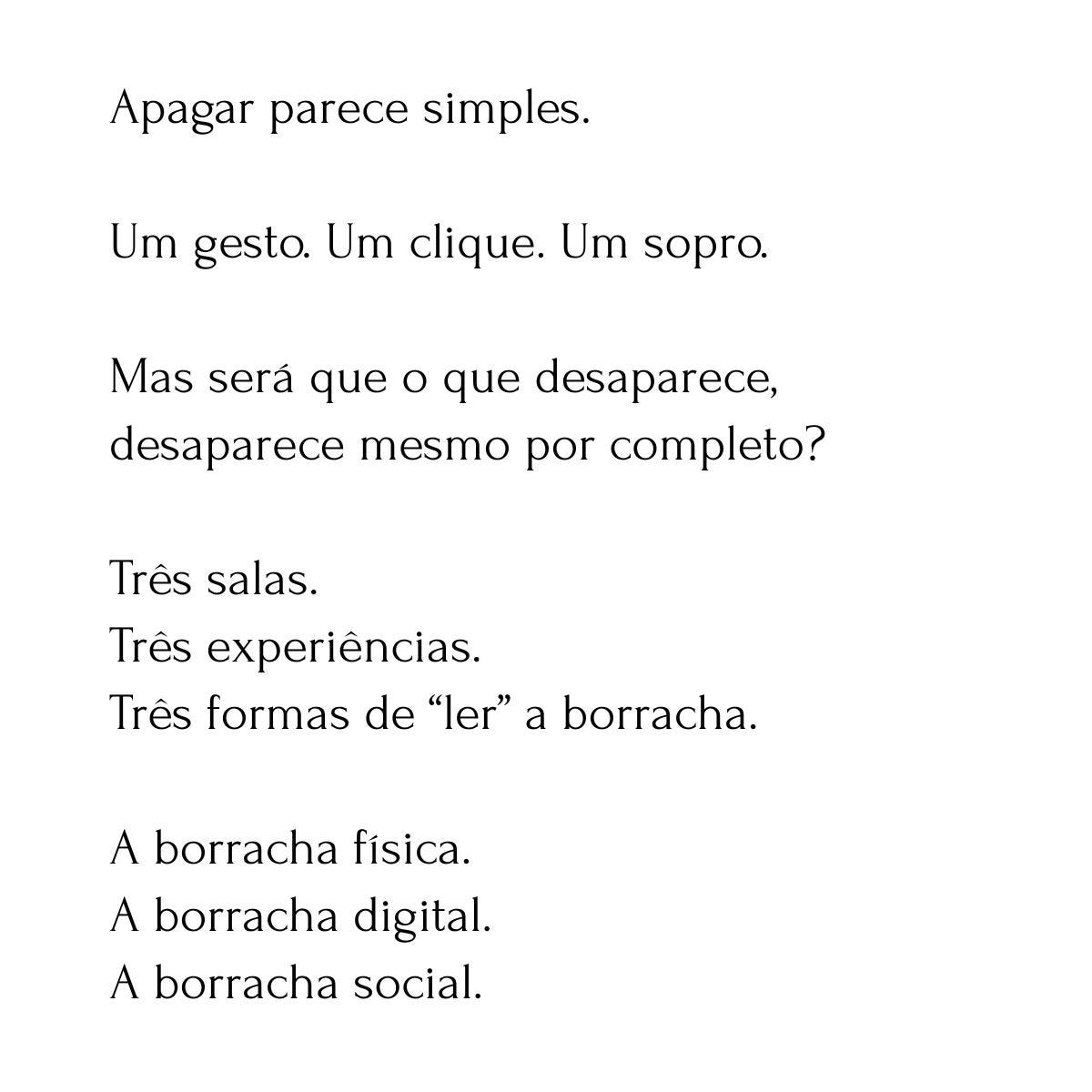 Cada leitura-exposição oferece três salas, três lentes, três modos de ver o mesmo objeto. A borracha foi apenas o início.