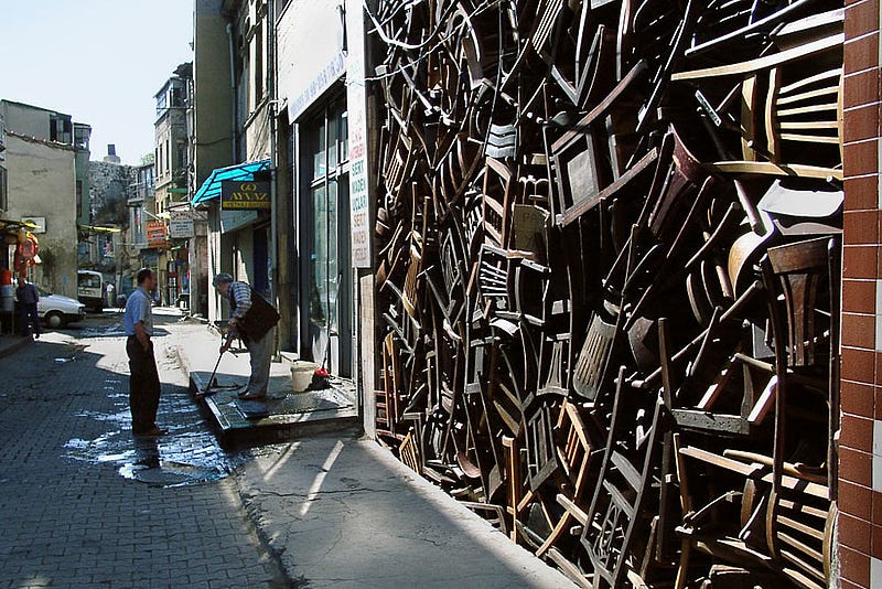 Entre dois edifícios de uma rua em Istambul, a artista colombiana Doris Salcedo criou esta instalação artística: uma torre de cadeiras encaixadas, comprimidas e empurradas umas contra as outras, que forma uma estrutura vertical frágil e monumental.